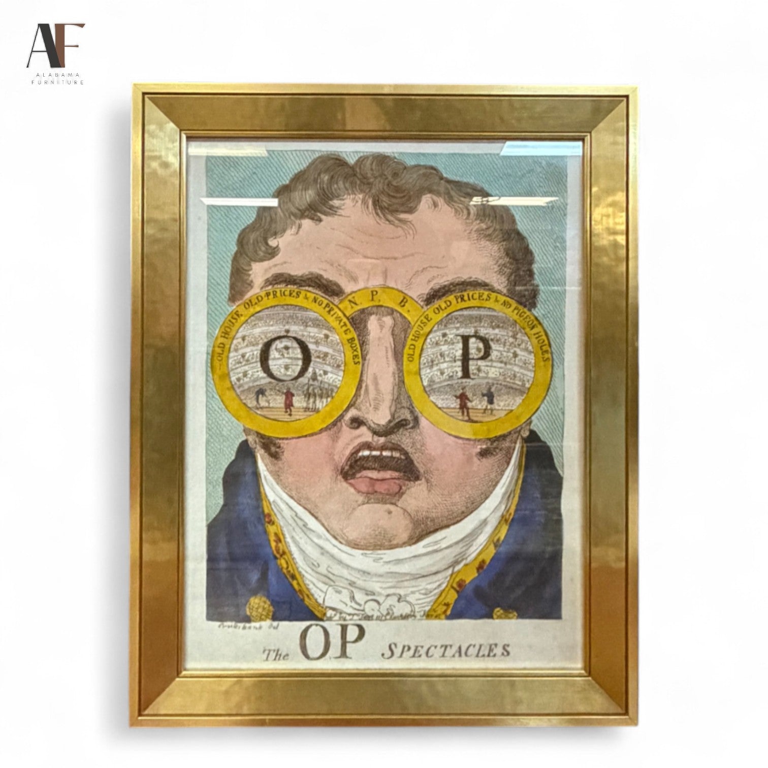 The full face of Clifford, based on a fashionably swathed neck-cloth and high coat-collar, fills the design. The mouth is open as if shouting. The eyes and part of the cheeks are covered by circles representing huge spectacles.